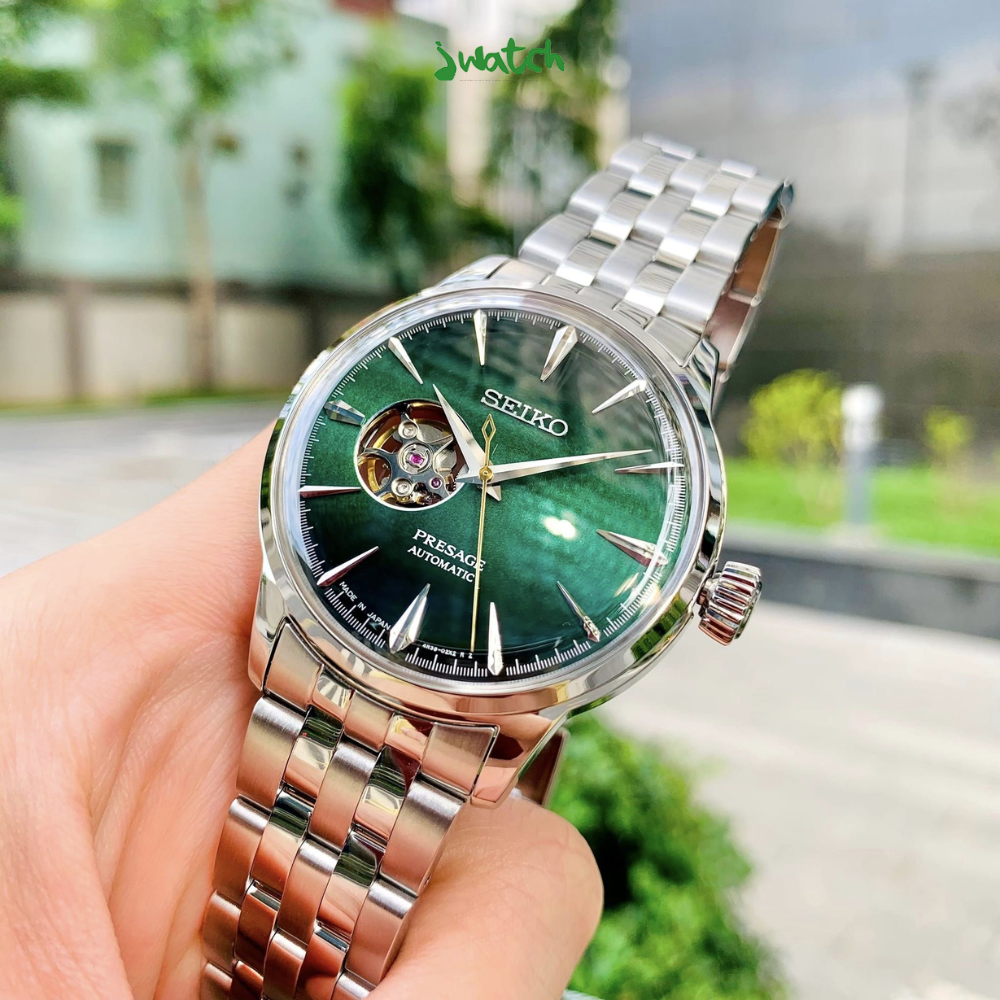 Seiko Presage SARY201 - SARY201 sở hữu thiết kế đầy lịch lãm, sang trọng cùng màu sắc độc đáo sẽ khiến cho người nhìn có cảm giác như đang hòa mình vào vị mát dịu của ly Shamrocker vây. Với vẻ ngoài đầy trẻ trung với tông màu sáng, toát lên vẻ hiện đại đầy cuốn hút thực sự có thể làm xiêu lòng bất cứ quý ông nào. Điểm nổi bật nhất của chiếc Seiko này chính là màu xanh lá trên nền dial giả đá cực kỳ chất lượng của hãng.