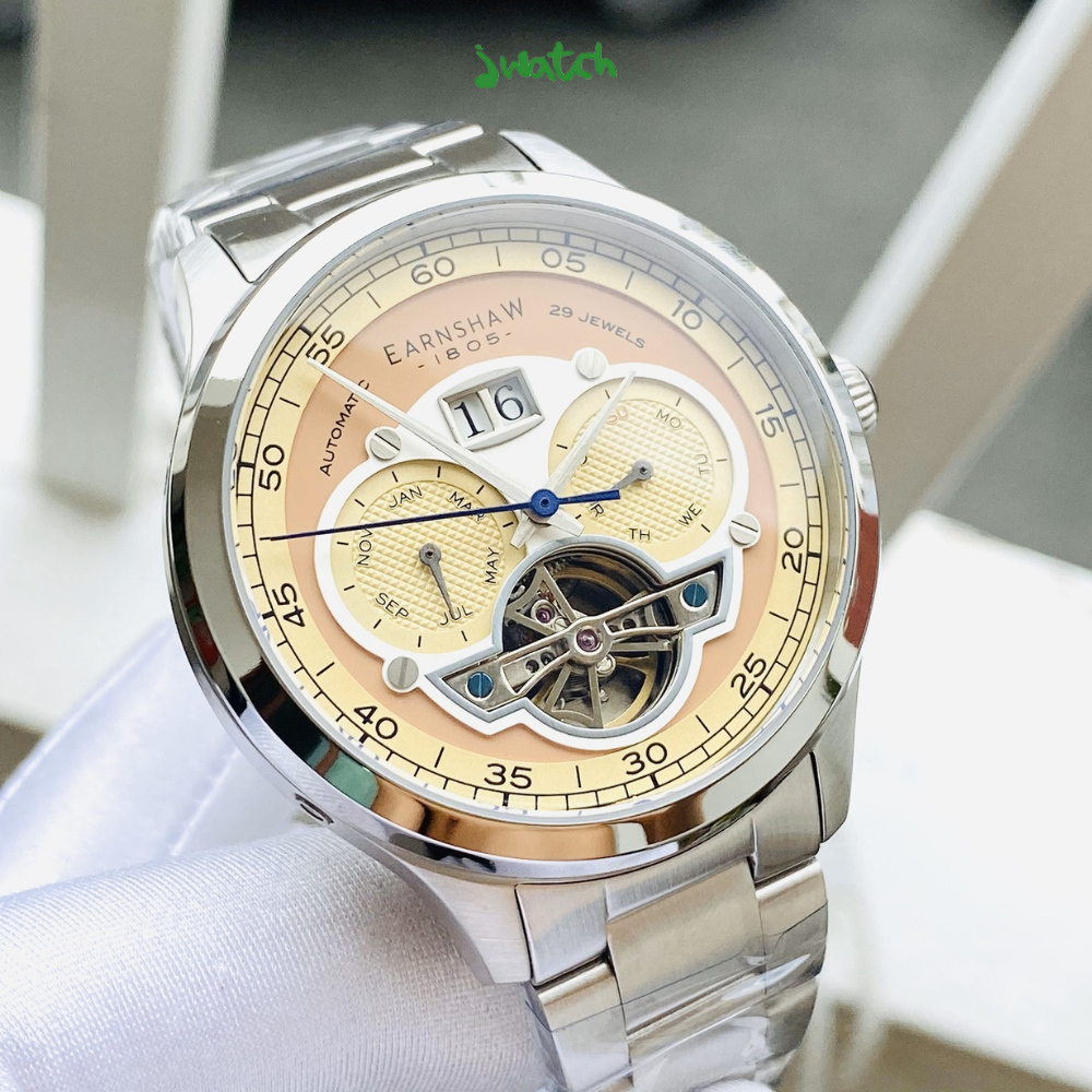 Thomas Earnshaw ES-8187-33 - Với các họa tiết chạm khắc thủ công tỉ mỉ đẹp đến đỗi khó cưỡng lại. Được đặt theo tên tòa nhà mang tính biểu tượng của nước Anh chiếc đồng hồ là một sự tôn vinh phong cách cổ điển của nó. Điểm nhất nổi bật chính là góc lộ máy ở hướng 6 giờ kết hợp với tông màu vàng nhạt và cam tạo ra sự mới lạ, trẻ trung và nổi bật cho anh em đeo trên cổ tay.